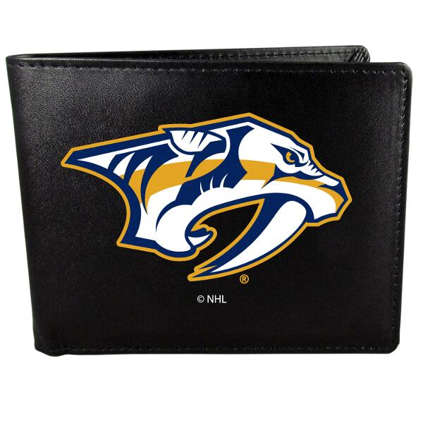 Sports fans do not have to sacrifice style with this classic bi-fold wallet that sports the Nashville Predators extra large logo. This men's fashion accessory has a leather grain look and expert craftmanship for a quality wallet at a great price. The wallet features inner credit card slots, windowed ID slot and a large billfold pocket. The front of the wallet features a printed team logo.