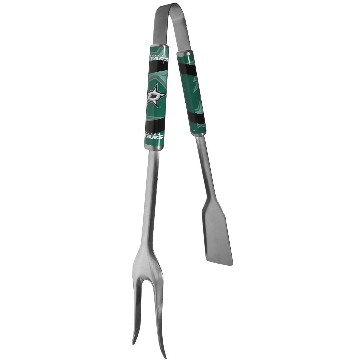 The perfect space saving tool! This stainless steel grilling tool is a spatula, tongs and fork all in one high-quality BBQ tool. The tool features bright Dallas Stars graphics.