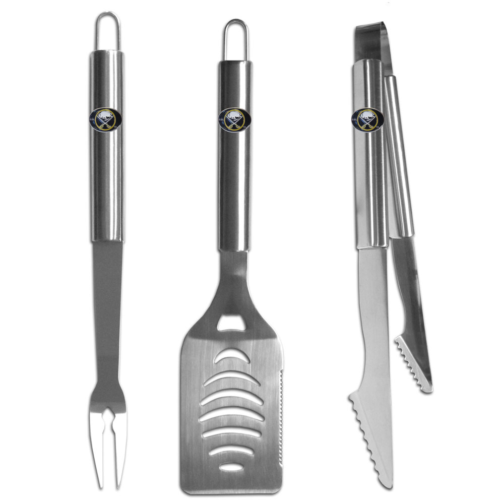 Our Buffalo Sabres stainless steel 3 pc BBQ tool set includes a large spatula with built in bottle opener, heavy duty tongs, and large fork. All the tools feature a team logo on the handle.