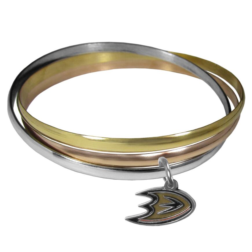 These beautiful bangles come in a interlocking style and feature a fully cast Anaheim Ducks charm with enameled team colors. The bracelet has a silver toned bangle, gold tone bangle and brass toned bangle.