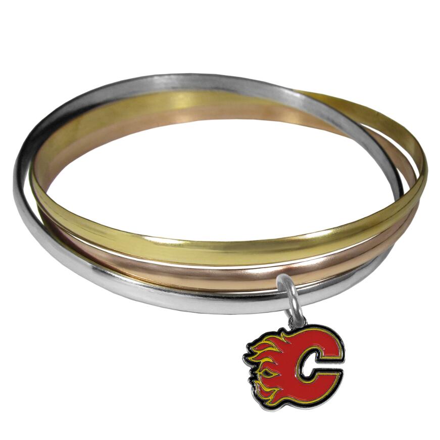 These beautiful bangles come in a interlocking style and feature a fully cast Calgary Flames charm with enameled team colors. The bracelet has a silver toned bangle, gold tone bangle and brass toned bangle.
