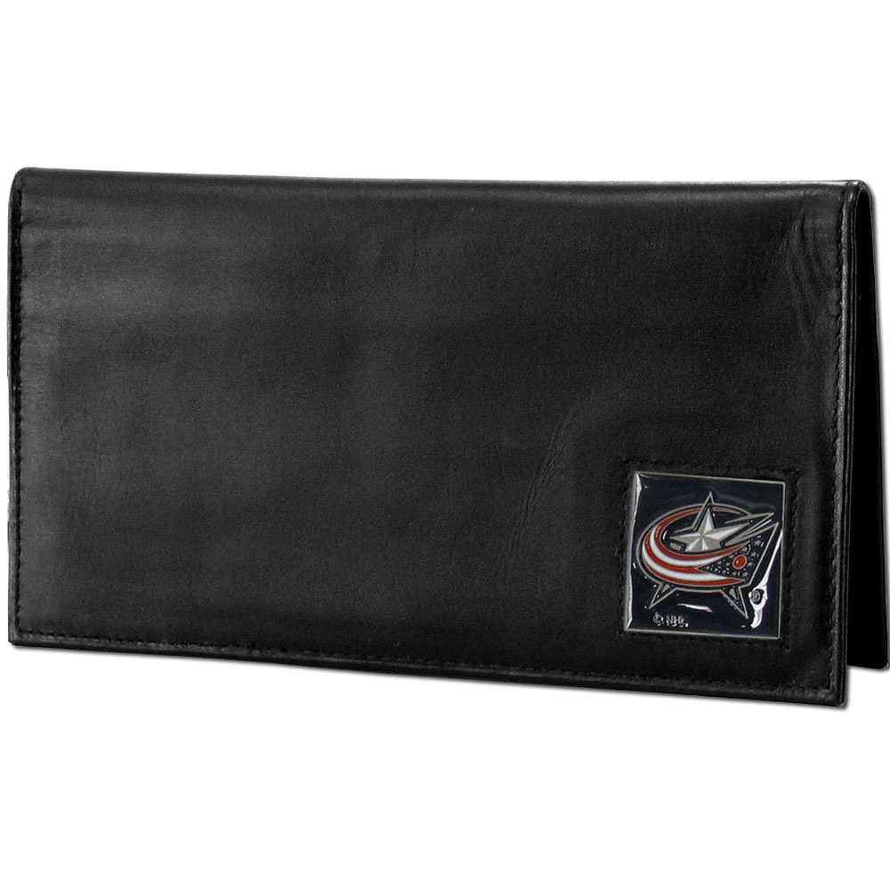 Our officially licensed checkbook cover is made of high quality leather and includes a card holder, clear ID window, and inside zipper pocket for added storage. Fully cast and enameled Columbus Blue Jackets team emblem on the front of the wallet.