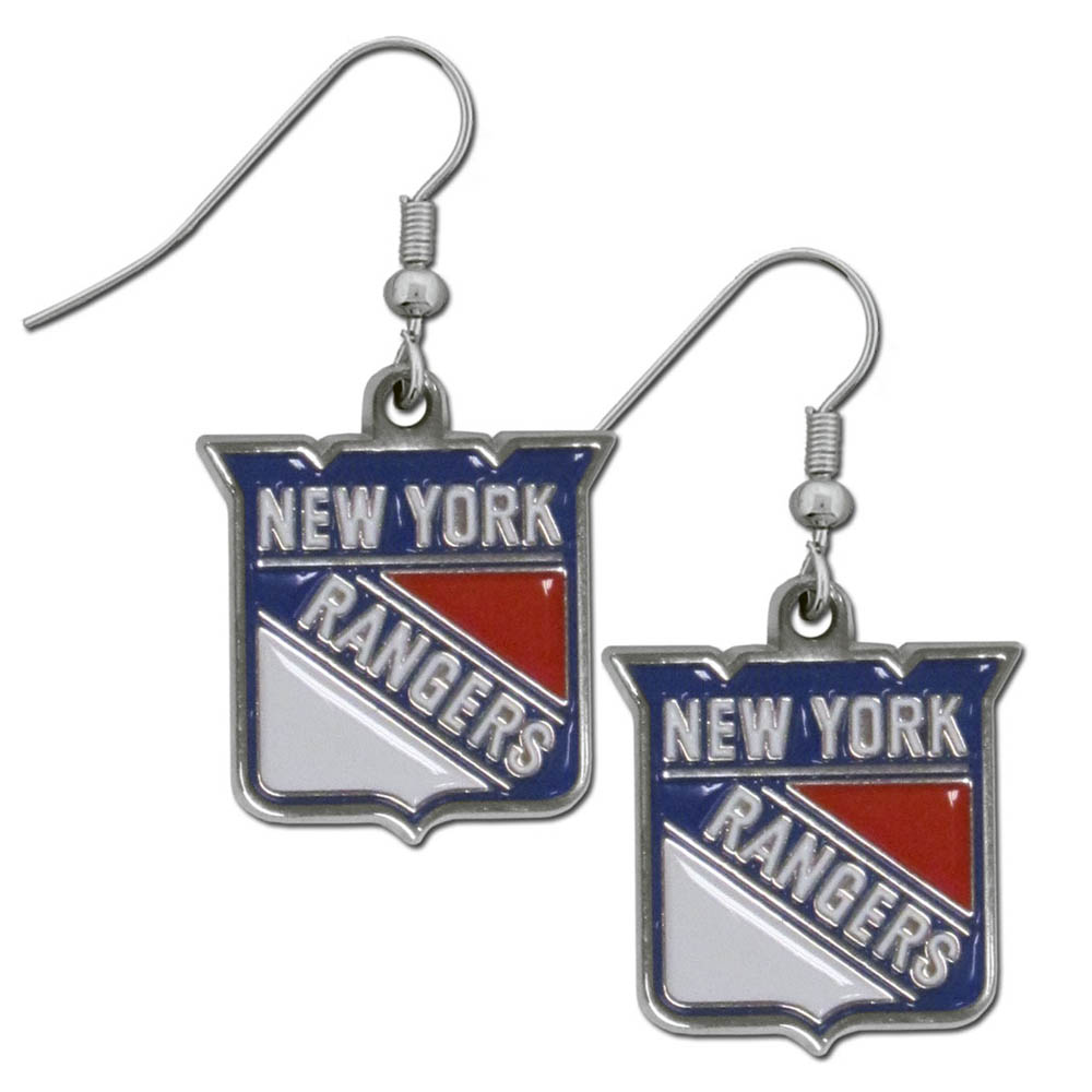 Our officially licensed chrome dangle earrings have fully cast New York Rangers charms with exceptional detail and a hand enameled finish. The earrings have a high polish nickel free chrome finish and hypoallergenic fishhook posts.