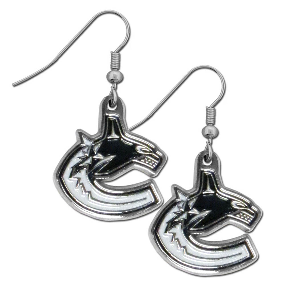Our officially licensed chrome dangle earrings have fully cast Vancouver Canucks charms with exceptional detail and a hand enameled finish. The earrings have a high polish nickel free chrome finish and hypoallergenic fishhook posts.