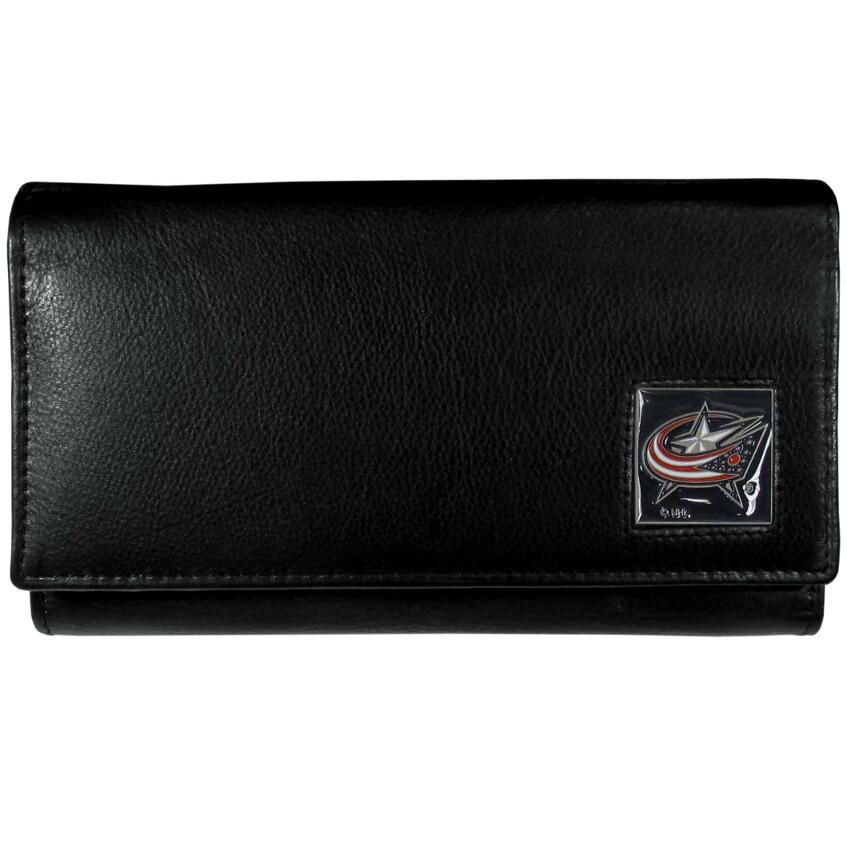 This genuine leather women's pocketbook features 9 credit card slots, a windowed ID slot, spacious front pocket, inner pocket and zippered coin pocket. The front of the pocketbook has a hand painted metal square with the Columbus Blue Jackets primary logo.