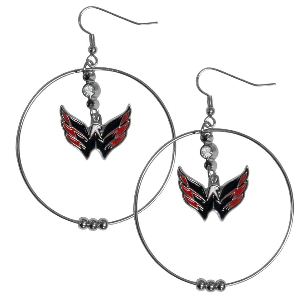 Our large hoop earrings have a fully cast and enameled Washington Capitals charm with enameled detail and a high polish nickel free chrome finish and rhinestone access. Hypoallergenic fishhook posts.