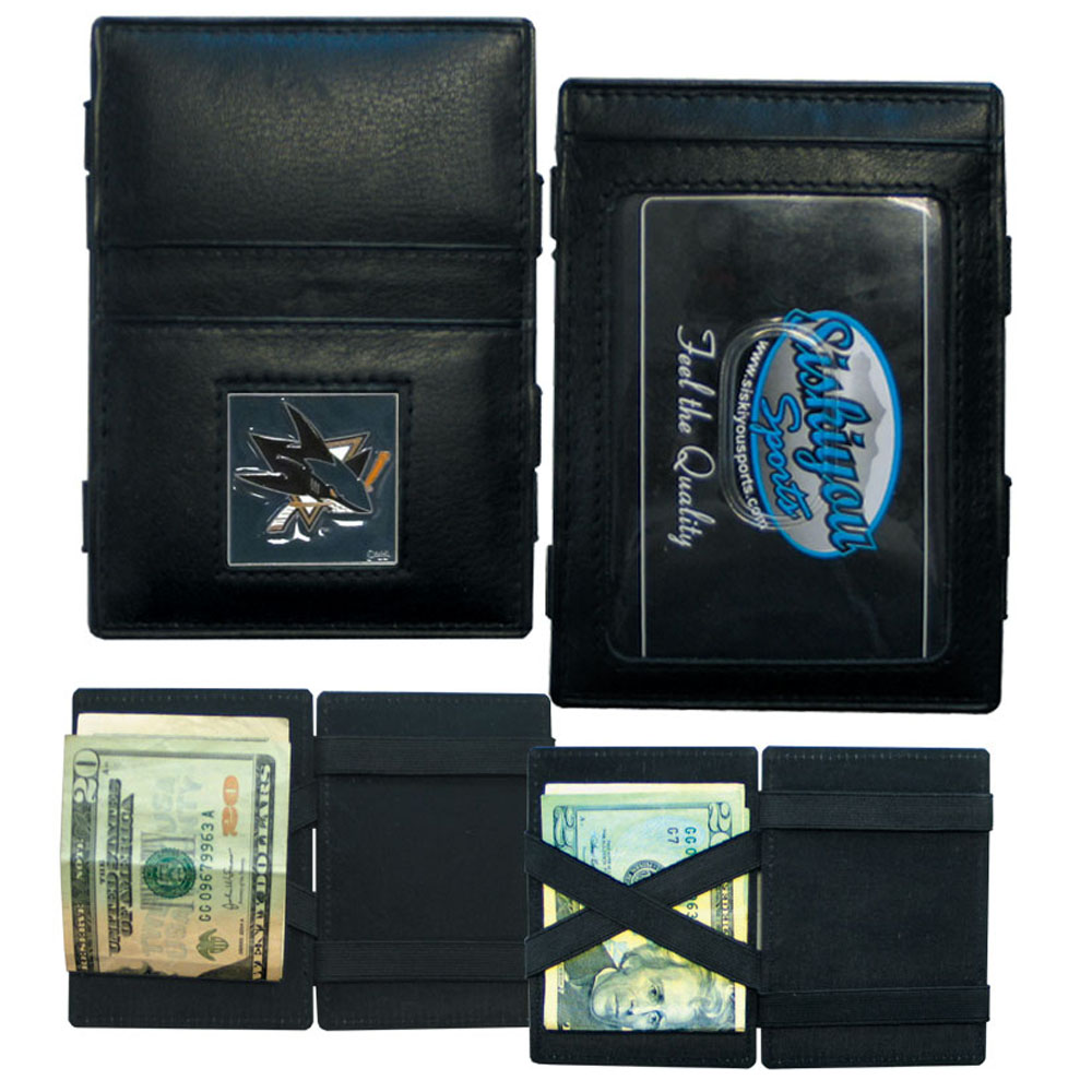 This officially licensed, innovative jacob's ladder wallet design traps cash with just a simple flip of the wallet! There are also outer pockets to store your ID and credit cards. The wallet is made of fine quality leather with a fully cast & enameled San Jose Sharks emblem on the front.