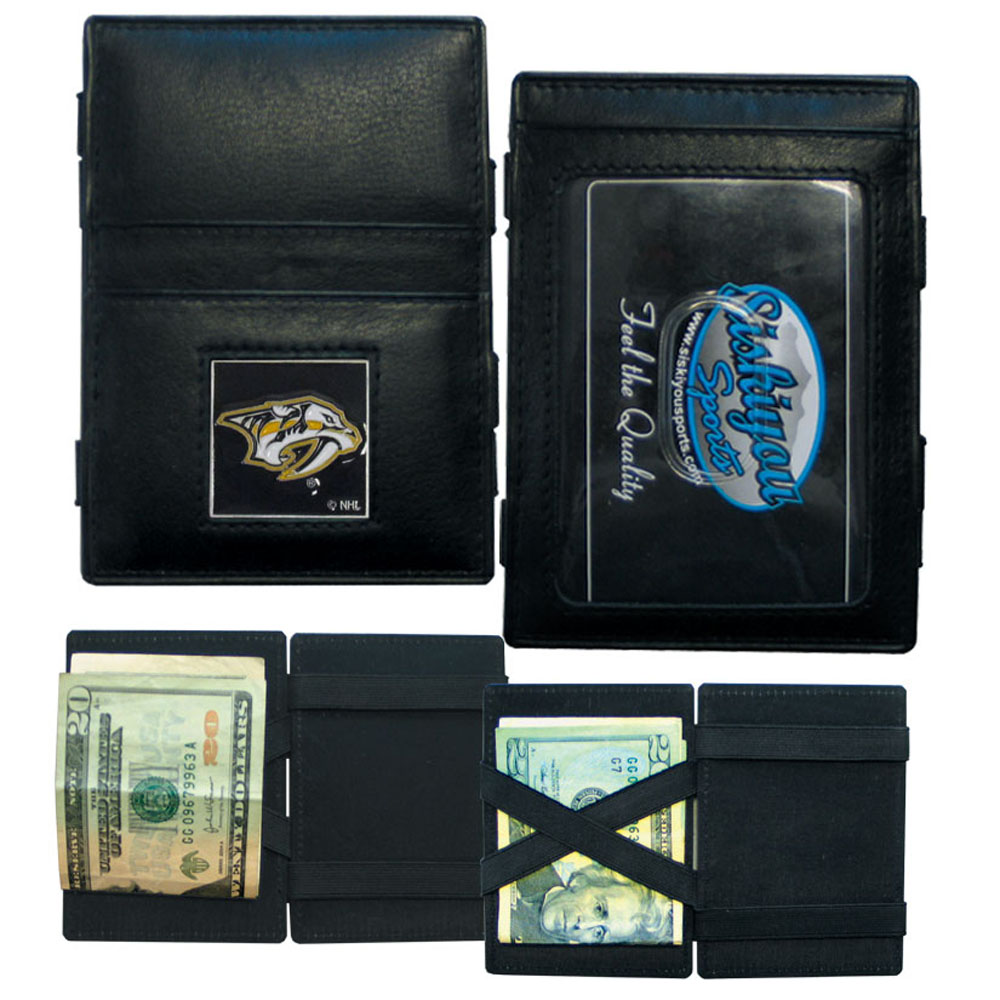 This officially licensed, innovative jacob's ladder wallet design traps cash with just a simple flip of the wallet! There are also outer pockets to store your ID and credit cards. The wallet is made of fine quality leather with a fully cast & enameled Nashville Predators emblem on the front.