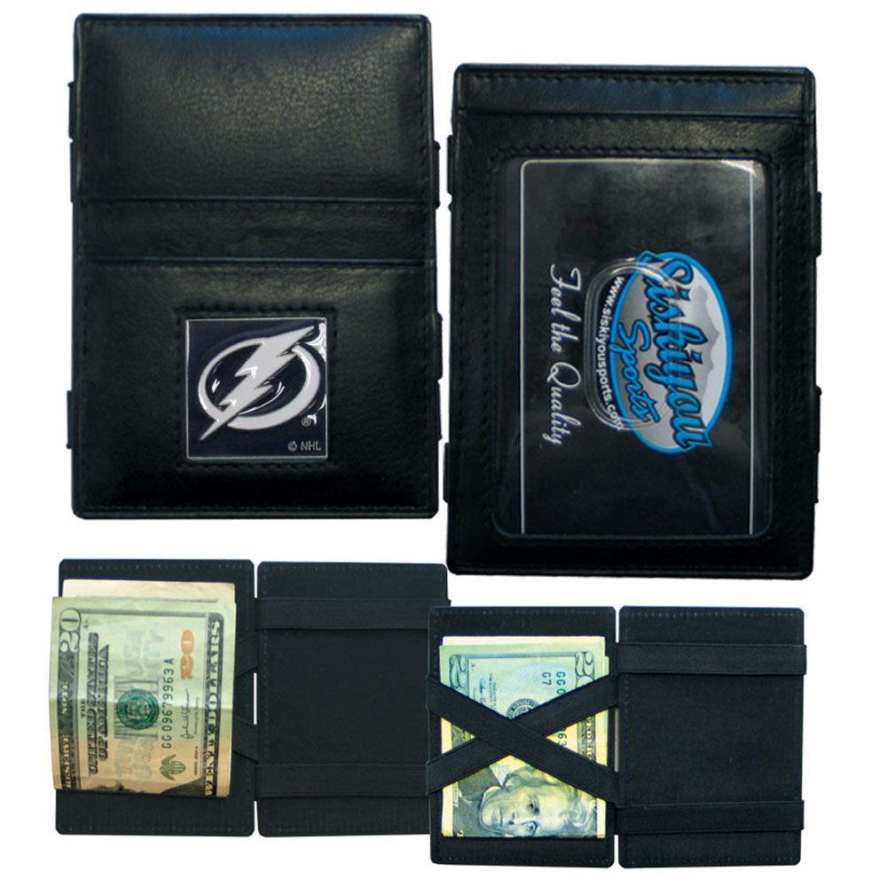 This officially licensed, innovative jacob's ladder wallet design traps cash with just a simple flip of the wallet! There are also outer pockets to store your ID and credit cards. The wallet is made of fine quality leather with a fully cast & enameled Tampa Bay Lightning emblem on the front.