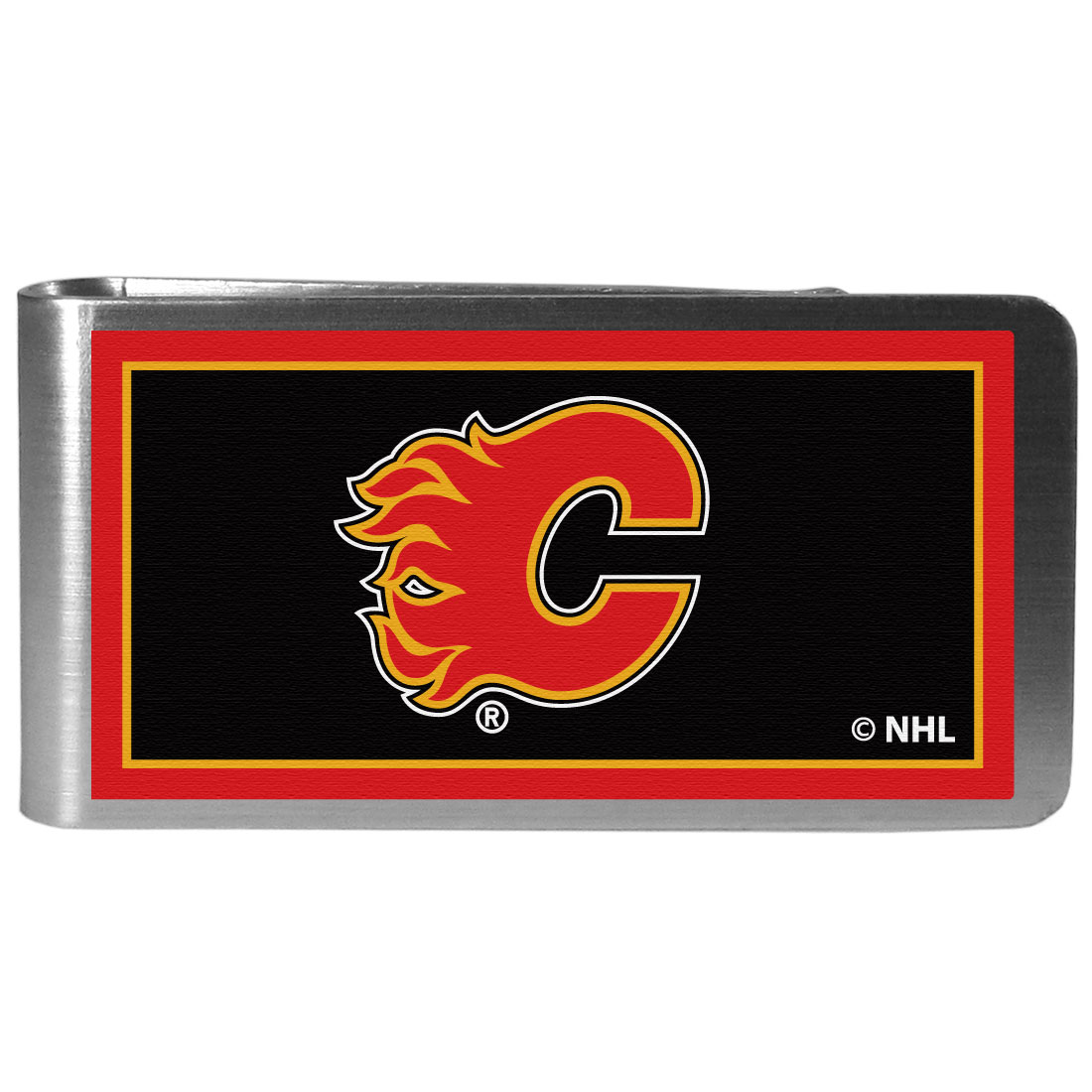 Our brightly colored steel money clips have a classic style and superior quality. The strong, steel clip has a primary colors of the Calgary Flames and their logo over the brushed metal finish creating a stylish men's fashion accessory that would make any fan proud.
