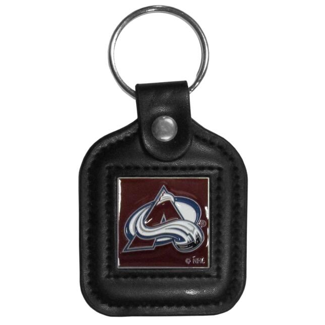 Our Colorado Avalanche black key fob with stitched detail and inlaid, metal team emblem with enameled color details.