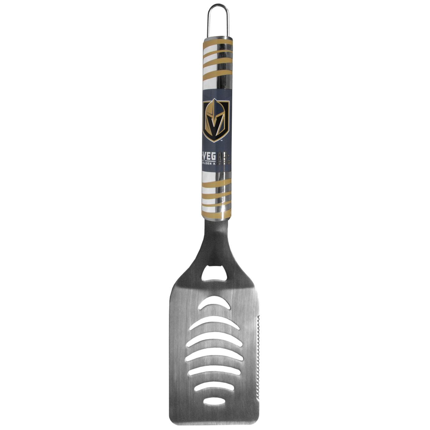 Our tailgater spatula really catches your eye with flashy chrome accents and vivid Vegas Golden Knights digital graphics. The 430 grade stainless steel spatula is a tough, heavy-duty tool that will last through years of tailgating fun. The spatula features a bottle opener and sharp serrated edge.