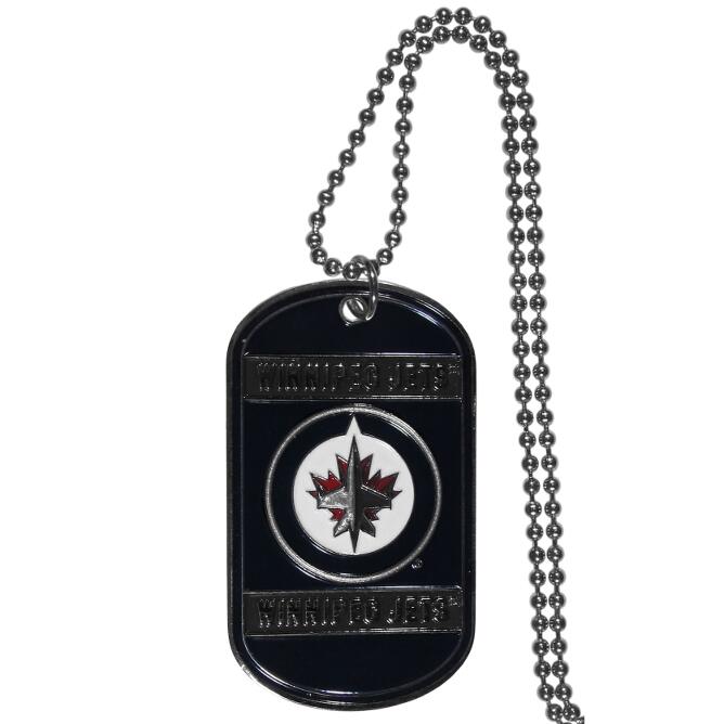 Expertly crafted Winnipeg Jets tag necklaces featuring fine detailing and a hand enameled finish with chrome accents. 26 inch ball chain.