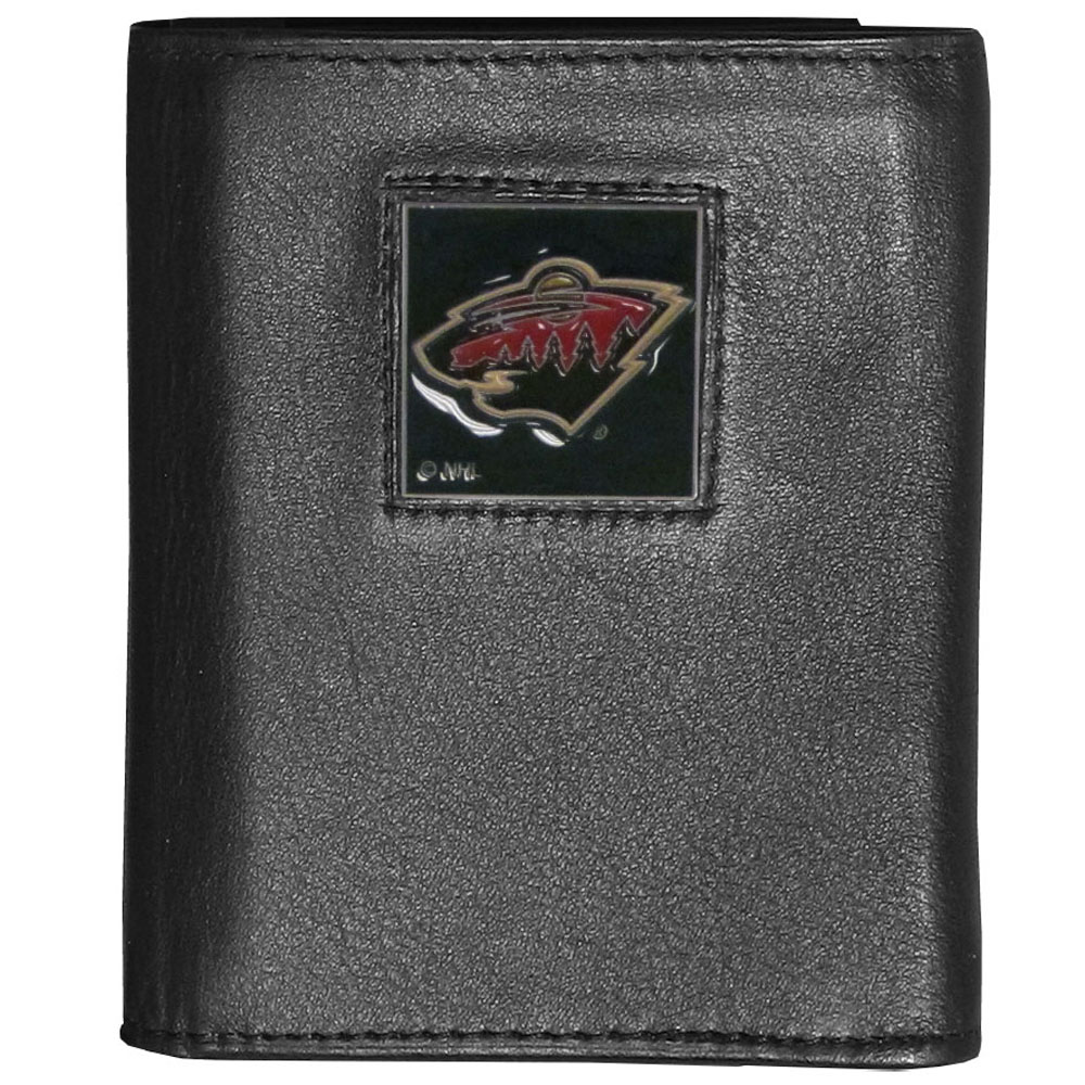 Our officially licensed fine grain leather wallet features numerous card slots, windowed ID slots, removable picture slots and large billfold pockets. This quality wallet has an enameled Minnesota Wild emblem on the front of the wallet making it a stylish way to show off your team pride.