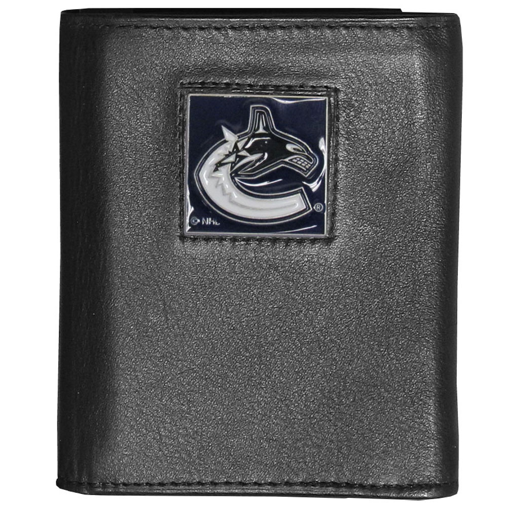 Our officially licensed fine grain leather wallet features numerous card slots, windowed ID slots, removable picture slots and large billfold pockets. This quality wallet has an enameled Vancouver Canucks emblem on the front of the wallet making it a stylish way to show off your team pride.