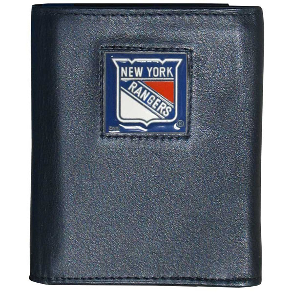 Our New York Rangers leather tri-fold wallet features a sculpted and hand painted team square on a black leather tri-fold. Includes an ID window, slots for credit cards and clear plastic photo sleeves. For a sporty feel, the liner of the wallet is made with a canvas liner.