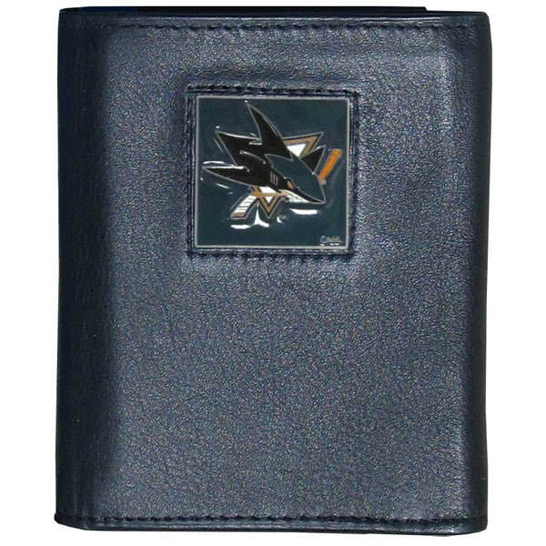 Our San Jose Sharks leather tri-fold wallet features a sculpted and hand painted team square on a black leather tri-fold. Includes an ID window, slots for credit cards and clear plastic photo sleeves. For a sporty feel, the liner of the wallet is made with a canvas liner.