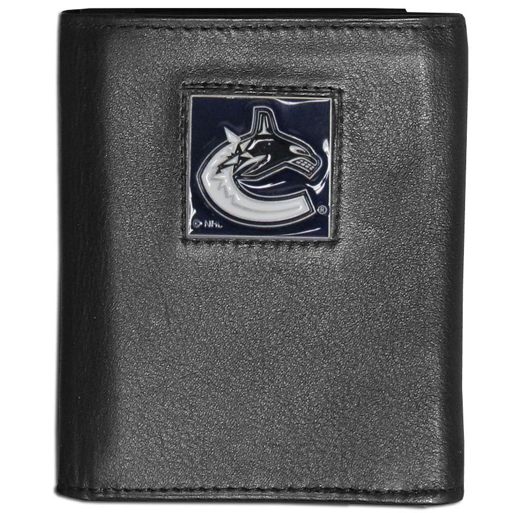 Our Vancouver Canucks leather tri-fold wallet features a sculpted and hand painted team square on a black leather tri-fold. Includes an ID window, slots for credit cards and clear plastic photo sleeves. For a sporty feel, the liner of the wallet is made with a canvas liner.