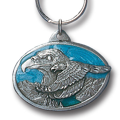 They key chain has intricately carved eagles on it. In the background is an eagles head with mountains underneath and on the top is an eagle soaring through the sky. The key chain is enhanced with a sparkly light blue enamel sky and dark blue enamel lake. On the back of the key chain are the words "Come dance with the west wind and touch all the mountain tops, sail o'er the canyons and up to the stars." John Denver. Siskiyou's unique key chain designs often become collector's items and are unequaled with the best craftsmanship. Key chain is 1-3/4" x 1-1/4".