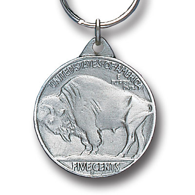 Buffalo Nickel key chain. This key chain looks like a Buffalo Nickel with an Indian's head on one side and a buffalo on the other. It has the year 1937 on the front, as well as "Liberty", just like on a real Buffalo Nickel. On the back it says, "United States of America" and "Five Cents". Key chain is 1-1/2" x 1-1/2".