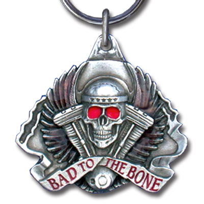 Bad to the bone key chain has a skull with red enamel eye sockets, wings on each side and a banner with "Bad to the Bone" on it. Key chain is enhanced with red and brown enamel. Key chain is 1-3/4" x 1-1/2".