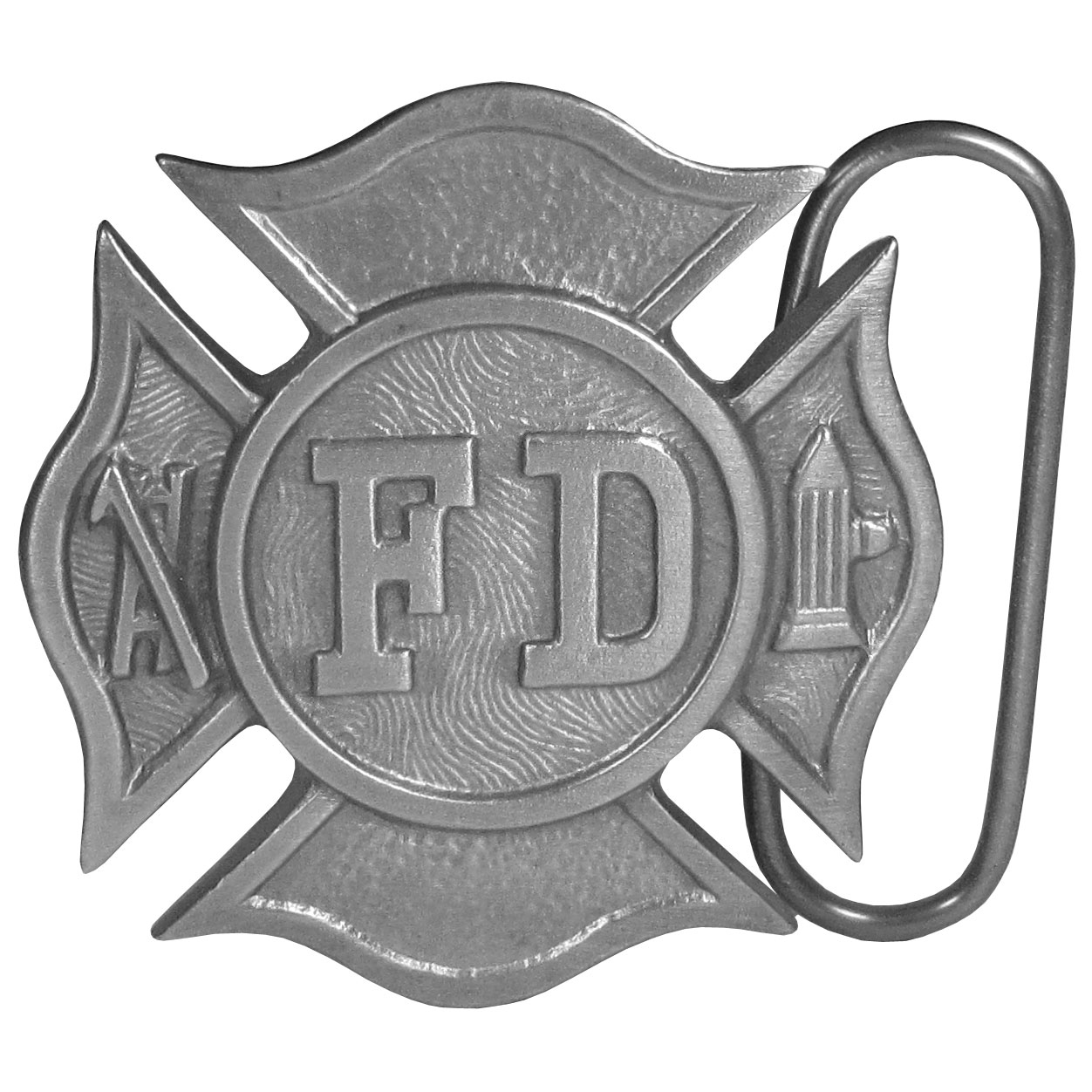 This belt buckle is dedicated to the Fire Department. It is shaped like a Maltese cross with "FD" in bold in the center. There is a fire hydrant and a pickaxe and ladder on each side. This exquisitely carved buckle is made of fully cast metal with a standard bale that fits up to 2" belts.