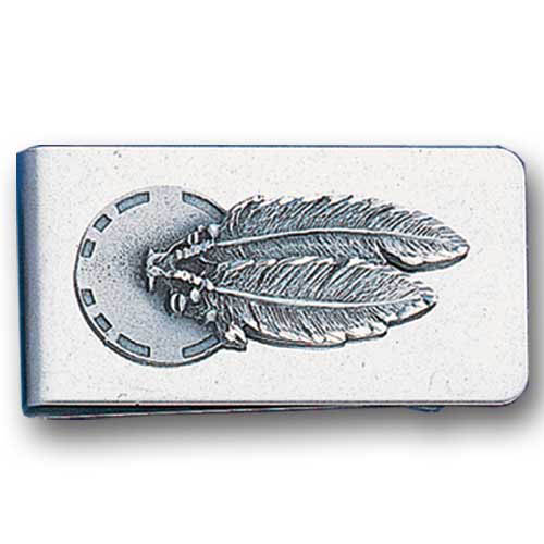 Stainless steel money clip with a detailed emblem featuring a Concho & Feather.