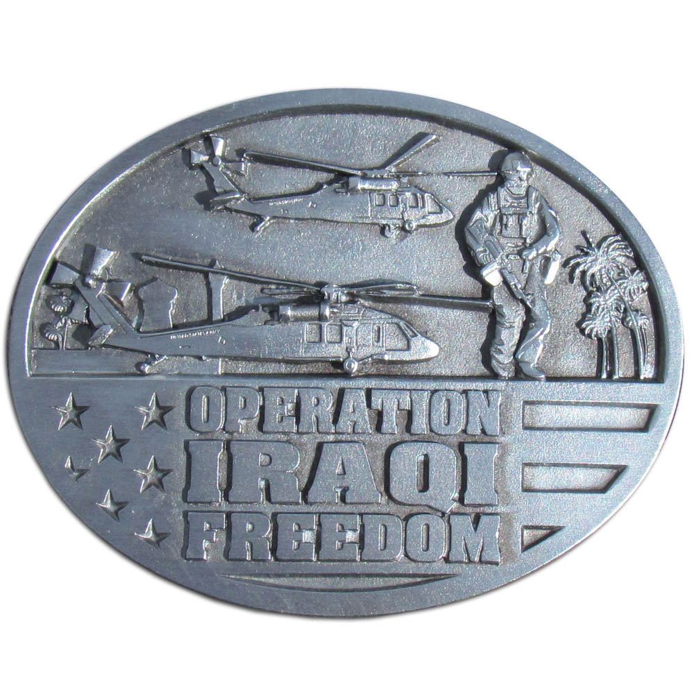 The words, "Operation Iraqi Freedom" are in the center of this oval buckle with a uniformed man, 2 helicoptors, date palm trees, a mosque and the stars and stripes surrounding. This exquisitely carved buckle is made with a standard bale that fits up to 2" belts. Siskiyou's unique buckle designs often become collector's items and are unequaled with the best craftsmanship.