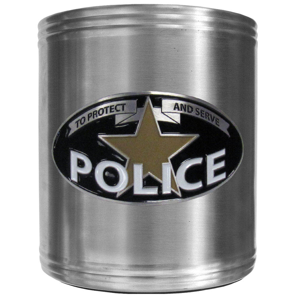 This insulated steel can cooler is a perfect addition to any tailgating or outdoor event. The cooler features a cast & enameled Police emblem.