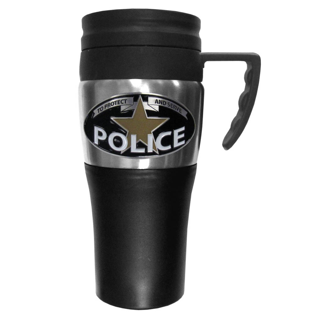 This two-toned 14 oz travel mug with steel accents features a fully cast & enameled Police emblem.