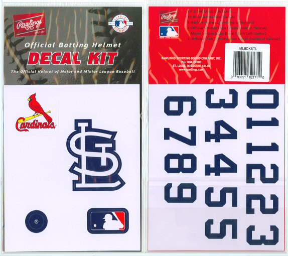 Chances are if you are viewing this item you are probably looking for decals for either your St. Louis Cardinals authentic batting helmet or your child's helmet for his little league baseball team. Either way this Rawlings decal kit is for you! It comes with 1 MLB logo decal, 1 St. Louis Cardinals team logo decal and a set of numbers. Easy to apply you can easily transform your collectible helmet into your favorite players helmet or transform you child's helmet into what you need for his team. Need a different team than the St. Louis Cardinals? The Cove has you covered as we have them for all MLB teams!