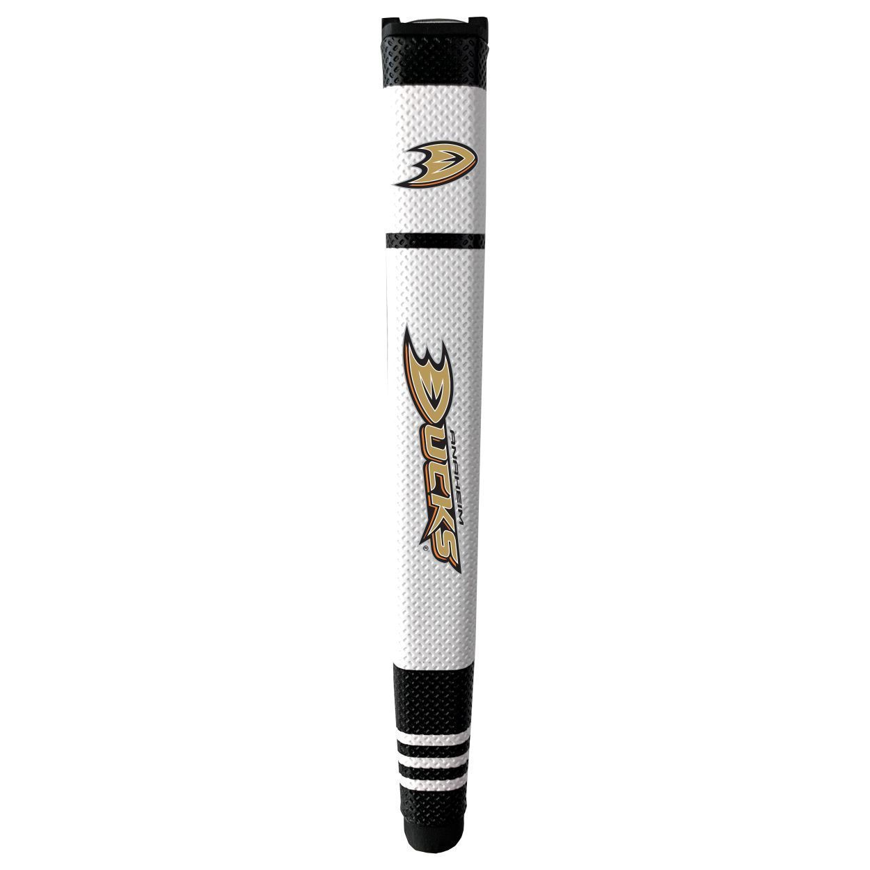 Anaheim Mighty Ducks Putter Grip (White with colored stripes) Durable rubber construction, Measures approx. 12.5" x 3.5" x 2", Printed graphics, Soft polyurethane surface, Includes removable ball marker, Debossed design, Material: 85% Rubber/15% PVC