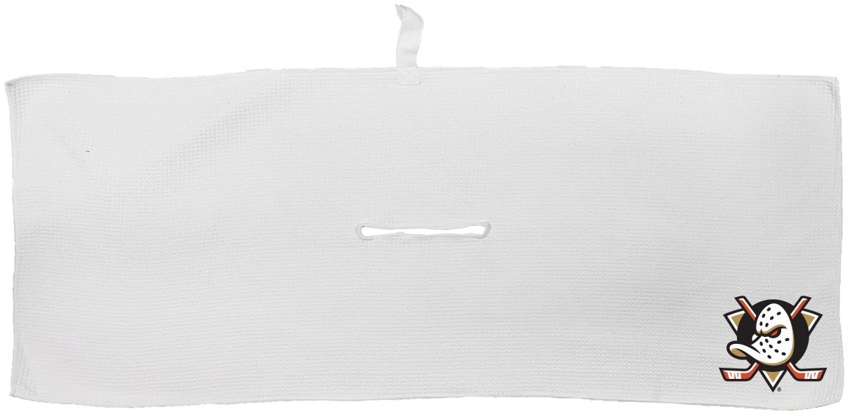 Anaheim Mighty Ducks Large Microfiber Towel - 16" x 40" (White) Carabiner attachment system, Measures approx. 16'' x 40'', Sublimated graphics, Center slit measures approx. 6" in diameter, Fabric loop, Material: 85% Polyester/15% Polyamide, Machine wash, tumble dry low, Officially licensed
