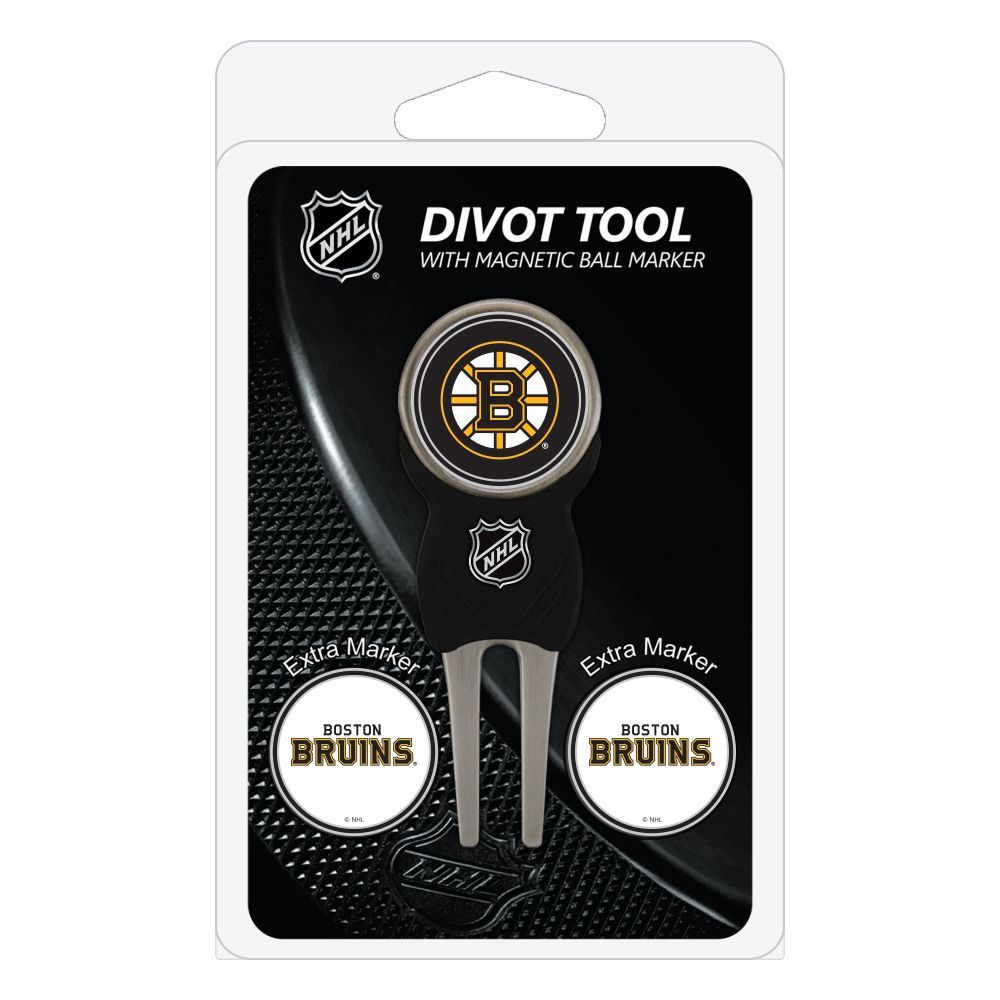 Boston Bruins Divot Tool Pack - Signature tool w/ 3 markers Add some team pride to your game on the green with the Team Golf? Divot Tool and Marker Set. This set includes three double-sided, enamel magnetic markers that feature the team logo and wordmark and a nickel-finished divot tool with the team logo. The magnetic markers are easily removed from and reattach to the divot tool, making it easy to mark your ball. Support your team with this team-inspired set.