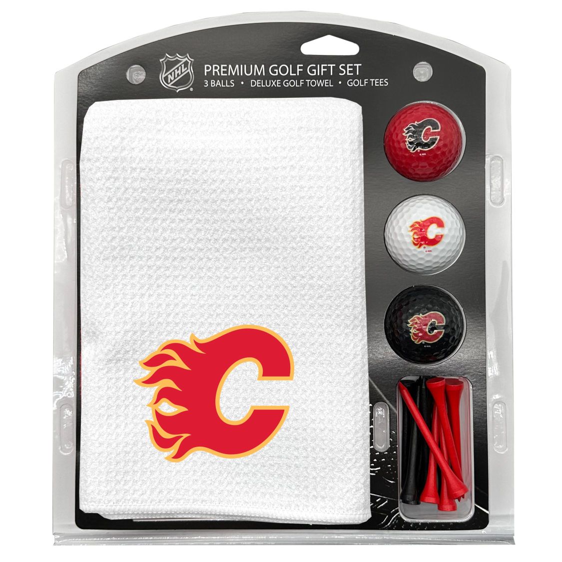 Calgary Flames Microfiber Towel Gift Set - 16 x 40 (White) 16” x 40” printed logo towel, 3 different color golf balls, 12 golf tees, High quality digital print