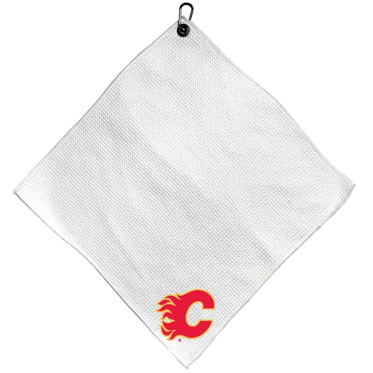 Calgary Flames Microfiber Small Towel - 15" x 15" (White) Carabiner attached, Measures approx. 15" x 15", Cleans without scratching club surface, Printed graphics, Material: 85% Polyester/15% Polyamide, Woven waffle fabric, Machine wash, tumble dry low, Officially licensed