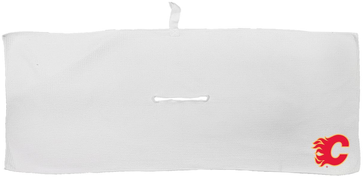 Calgary Flames Large Microfiber Towel - 16" x 40" (White) Carabiner attachment system, Measures approx. 16'' x 40'', Sublimated graphics, Center slit measures approx. 6" in diameter, Fabric loop, Material: 85% Polyester/15% Polyamide, Machine wash, tumble dry low, Officially licensed