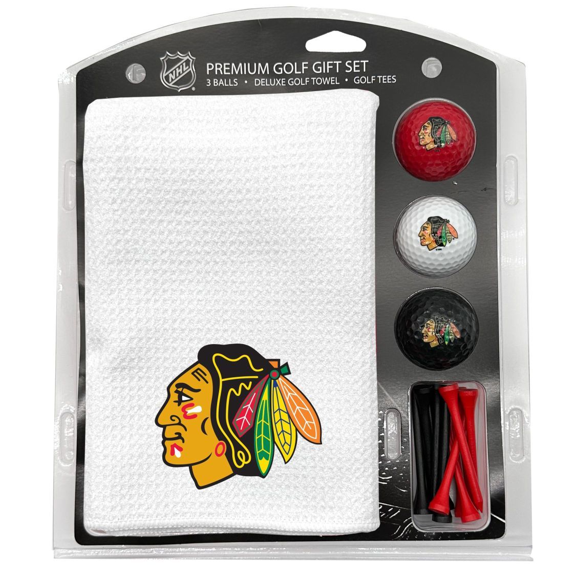 Chicago Blackhawks Microfiber Towel Gift Set - 16 x 40 (White) 16” x 40” printed logo towel, 3 different color golf balls, 12 golf tees, High quality digital print