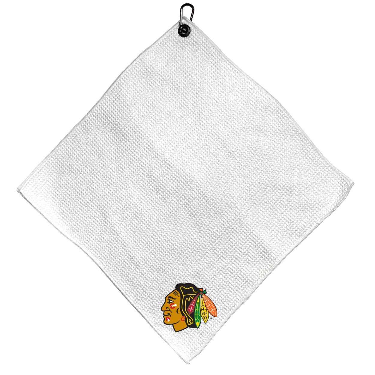Chicago Blackhawks Microfiber Small Towel - 15" x 15" (White) Carabiner attached, Measures approx. 15" x 15", Cleans without scratching club surface, Printed graphics, Material: 85% Polyester/15% Polyamide, Woven waffle fabric, Machine wash, tumble dry low, Officially licensed