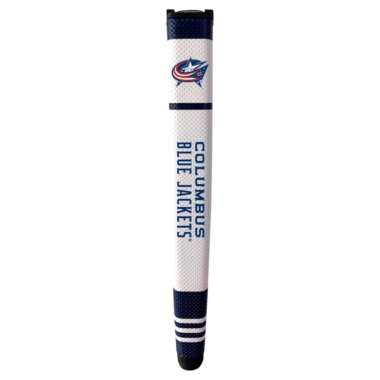 Columbus Blue Jackets Putter Grip (White with colored stripes) Durable rubber construction, Measures approx. 12.5" x 3.5" x 2", Printed graphics, Soft polyurethane surface, Includes removable ball marker, Debossed design, Material: 85% Rubber/15% PVC