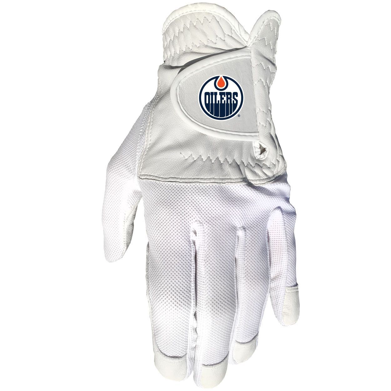 Edmonton Oilers Cool mesh with cabretta leather - one size - mens left 100% cabretta leather palm and finger tips, High quality digital print, Fits most hand sizes, Left hand only (for right handed golfers), Great gift for the golfer in your life!