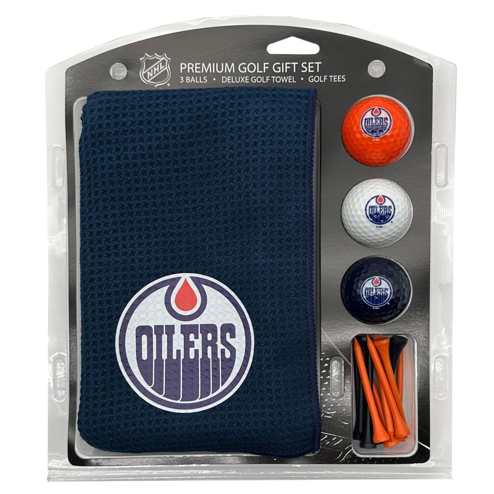 Edmonton Oilers Microfiber Towel Gift Set - 16 x 40 (Colored) 16” x 40” printed logo towel, 3 different color golf balls, 12 golf tees, High quality digital print
