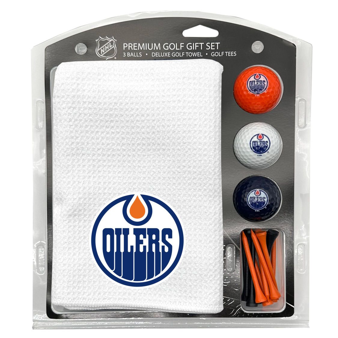 Edmonton Oilers Microfiber Towel Gift Set - 16 x 40 (White) 16” x 40” printed logo towel, 3 different color golf balls, 12 golf tees, High quality digital print