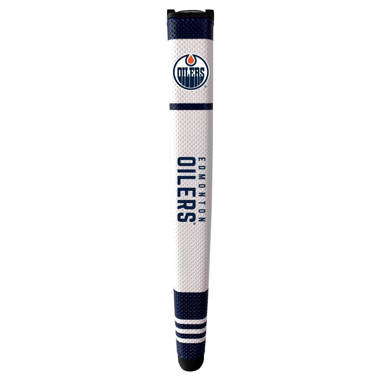 Edmonton Oilers Putter Grip (White with colored stripes) Durable rubber construction, Measures approx. 12.5" x 3.5" x 2", Printed graphics, Soft polyurethane surface, Includes removable ball marker, Debossed design, Material: 85% Rubber/15% PVC