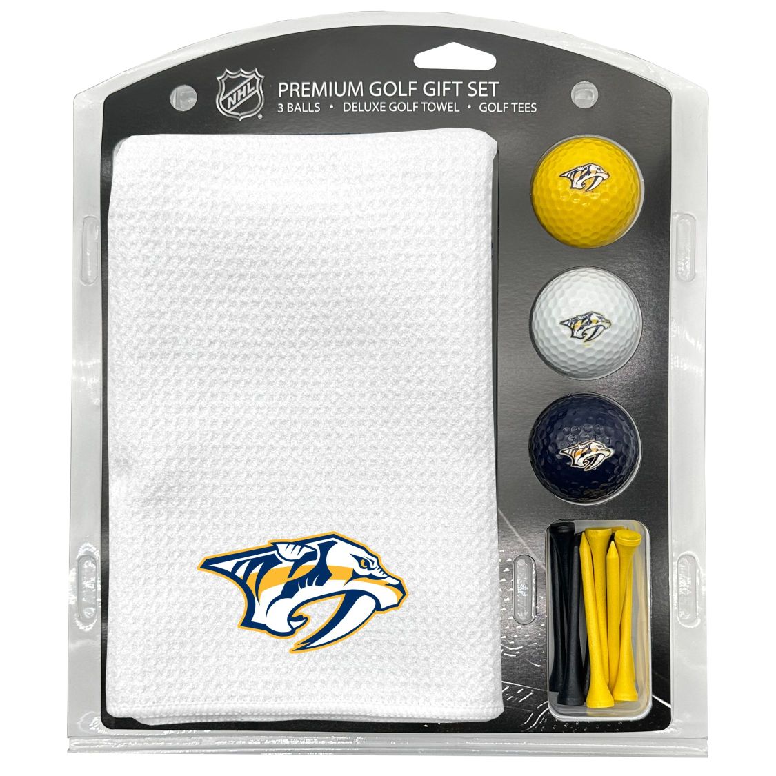 Nashville Predators Microfiber Towel Gift Set - 16 x 40 (White) 16” x 40” printed logo towel, 3 different color golf balls, 12 golf tees, High quality digital print