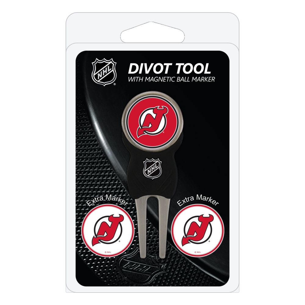 New Jersey Devils Divot Tool Pack - Signature tool w/ 3 markers Add some team pride to your game on the green with the Team Golf? Divot Tool and Marker Set. This set includes three double-sided, enamel magnetic markers that feature the team logo and wordmark and a nickel-finished divot tool with the team logo. The magnetic markers are easily removed from and reattach to the divot tool, making it easy to mark your ball. Support your team with this team-inspired set.