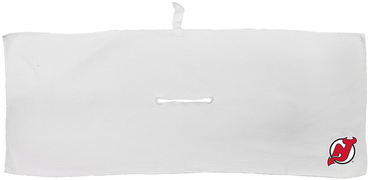 New Jersey Devils Large Microfiber Towel - 16" x 40" (White) Carabiner attachment system, Measures approx. 16'' x 40'', Sublimated graphics, Center slit measures approx. 6" in diameter, Fabric loop, Material: 85% Polyester/15% Polyamide, Machine wash, tumble dry low, Officially licensed