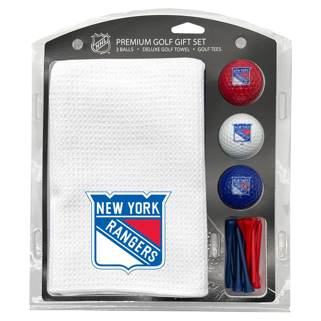 New York Rangers Microfiber Towel Gift Set - 16 x 40 (White) 16” x 40” printed logo towel, 3 different color golf balls, 12 golf tees, High quality digital print