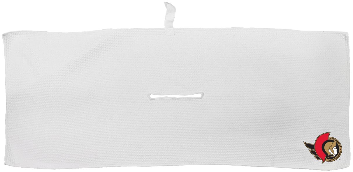 Ottawa Senators Large Microfiber Towel - 16" x 40" (White) Carabiner attachment system, Measures approx. 16'' x 40'', Sublimated graphics, Center slit measures approx. 6" in diameter, Fabric loop, Material: 85% Polyester/15% Polyamide, Machine wash, tumble dry low, Officially licensed