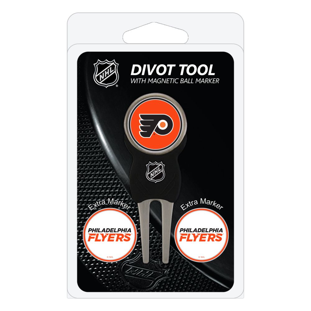Philadelphia Flyers Divot Tool Pack - Signature tool w/ 3 markers Add some team pride to your game on the green with the Team Golf? Divot Tool and Marker Set. This set includes three double-sided, enamel magnetic markers that feature the team logo and wordmark and a nickel-finished divot tool with the team logo. The magnetic markers are easily removed from and reattach to the divot tool, making it easy to mark your ball. Support your team with this team-inspired set.
